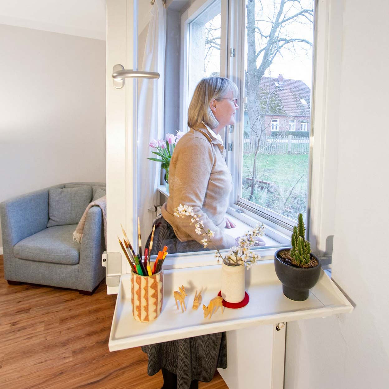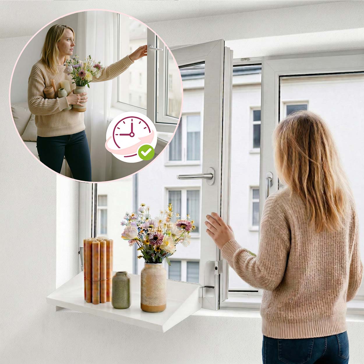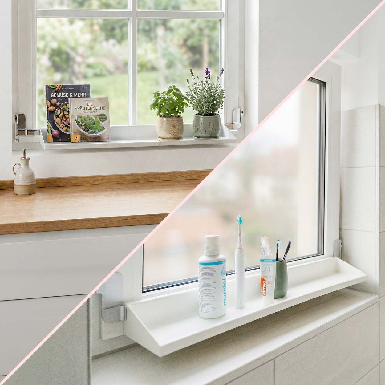 Die erste Fensterbank, die sich mit deinem Fenster mitbewegt. Für entspanntes Lüften ohne Umräumen.